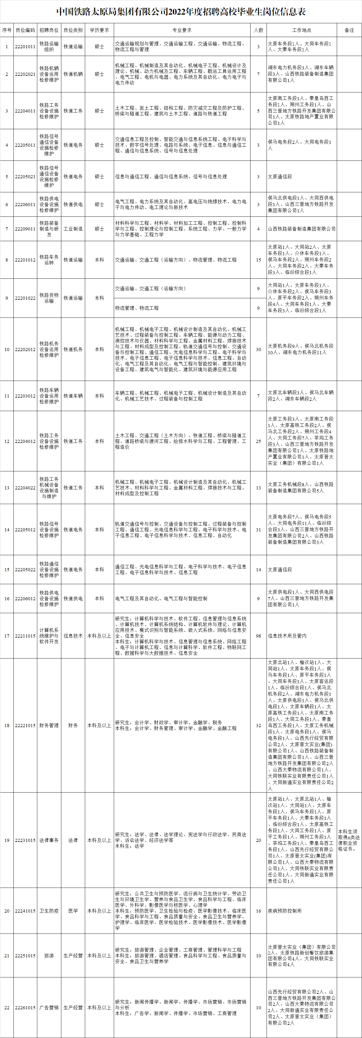 招聘崗位、學(xué)歷、專業(yè)、人數(shù)和工作地點(diǎn)等內(nèi)容詳見《中國(guó)鐵路太原局集團(tuán)有限公司2022年度招聘高校畢業(yè)生崗位信息表》。