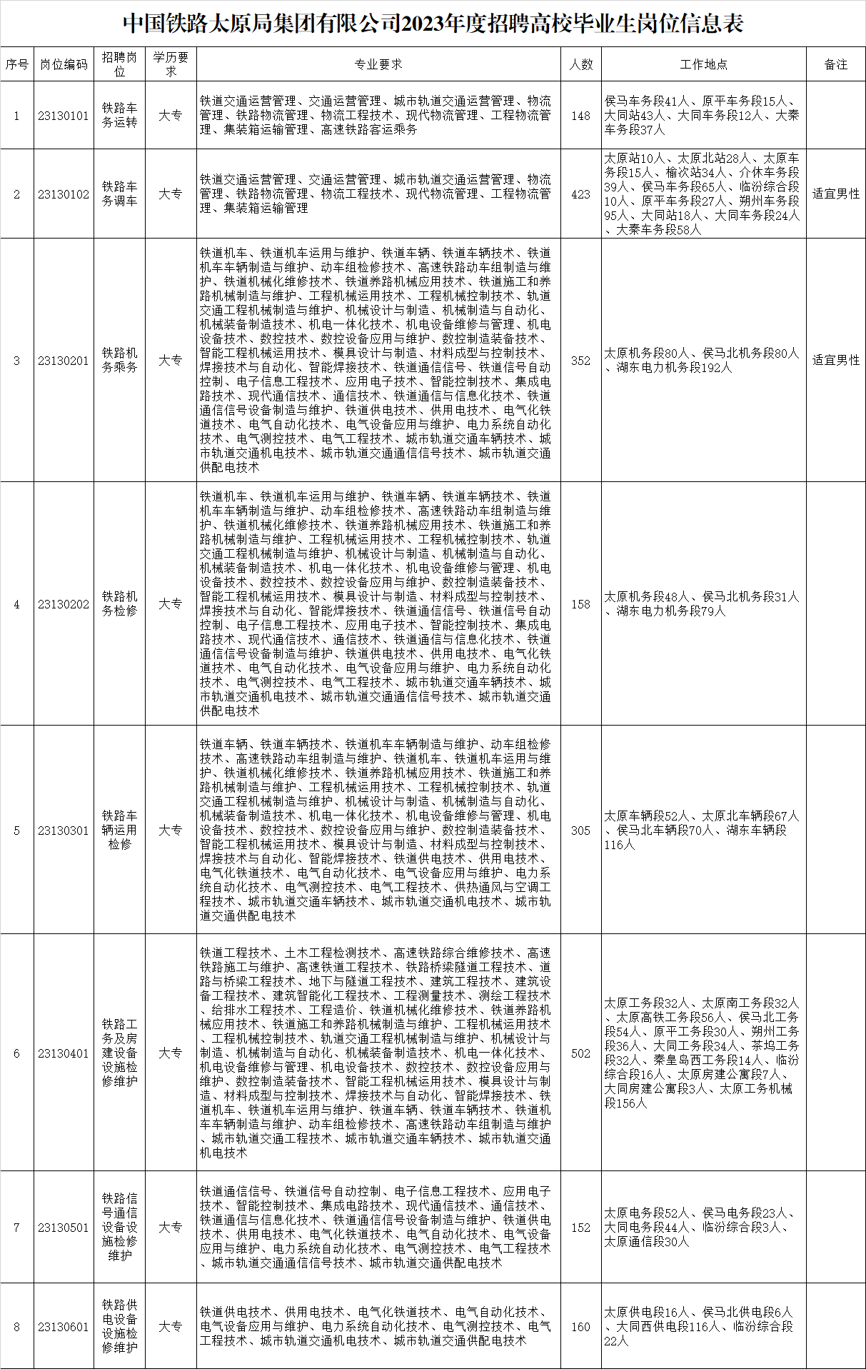 2022-11-30 22:02:02閱讀()中國鐵路太原局集團有限公司根據企業(yè)發(fā)展需要,現將2023年全日制普通高等職業(yè)院校高職(大專)畢業(yè)生招聘有關事項公告如下:
