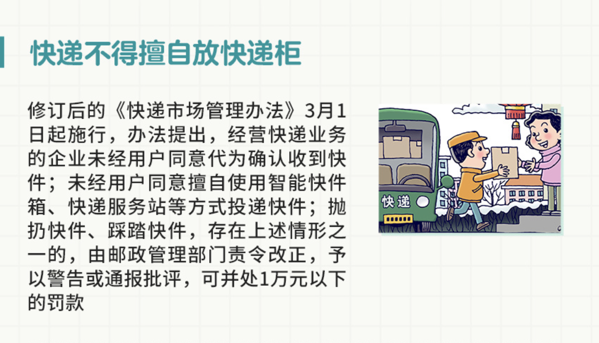 “快遞員未經(jīng)用戶同意擅自使用智能快件箱、快遞服務(wù)站等方式投遞快件”