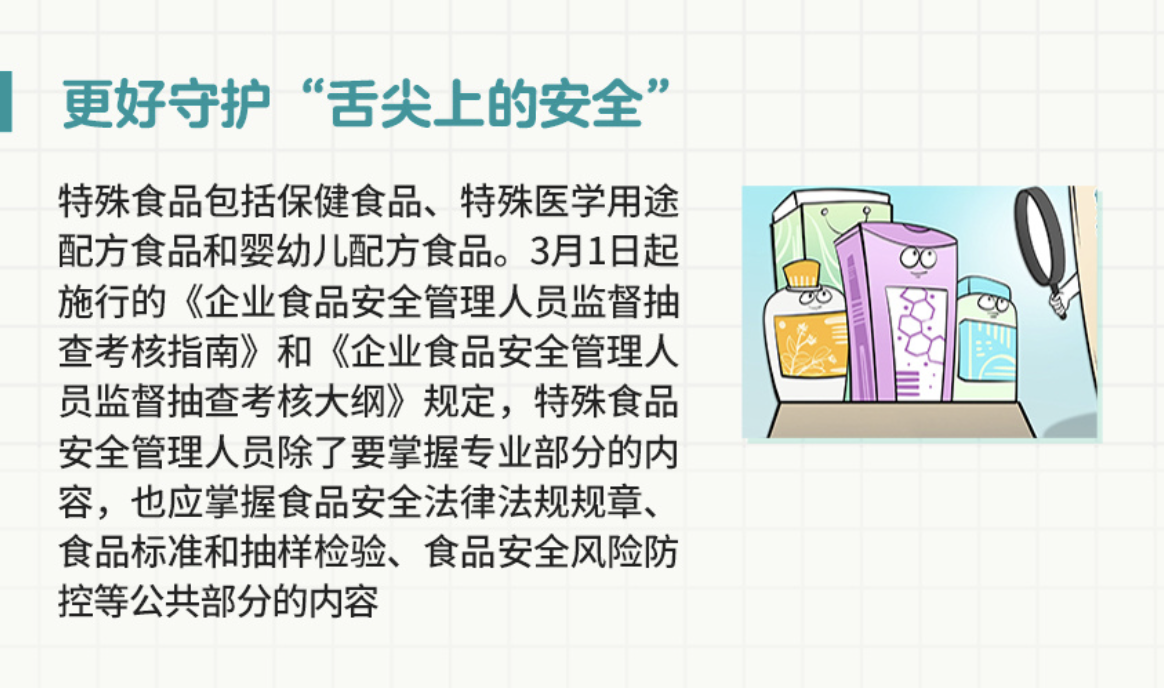 3月1日起施行的《企業(yè)食品安全管理人員監(jiān)督抽查考核指南》和《企業(yè)食品安全管理人員監(jiān)督抽查考核大綱》規(guī)定,特殊食品(注:特殊食品包括保健食品、特殊醫(yī)學(xué)用途配方食品和嬰幼兒配方食品)安全管理人員除了要掌握專業(yè)部分的內(nèi)容,也應(yīng)掌握食品安全法律法規(guī)規(guī)章、食品標(biāo)準(zhǔn)和抽樣檢驗(yàn)、食品安全風(fēng)險(xiǎn)防控等公共部分的內(nèi)容。