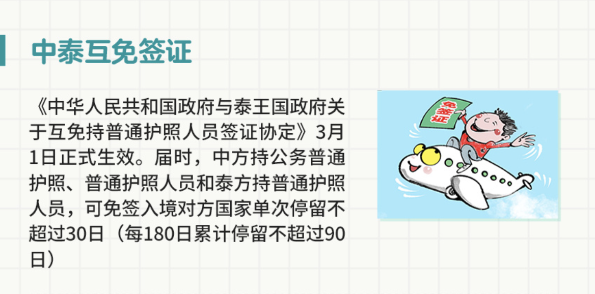 《中華人民共和國(guó)政府與泰王國(guó)政府關(guān)于互免持普通護(hù)照人員簽證協(xié)定》3月1日正式生效。屆時(shí),中方持公務(wù)普通護(hù)照、普通護(hù)照人員和泰方持普通護(hù)照人員,可免簽入境對(duì)方國(guó)家單次停留不超過30日 (每180日累計(jì)停留不超過90日)。