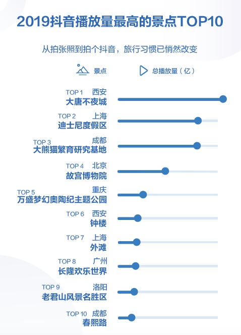 在抖音,一個人帶火一座城已成獨(dú)特現(xiàn)象。23歲的抖音用戶@皮卡晨化身“不倒翁小姐姐”,掀起握手狂潮,吸引人們爭相實(shí)地打卡。報告顯示,#大唐不夜城不倒翁#相關(guān)視頻播放量超23億次,西安大唐不夜城景點(diǎn)位列2019抖音播放量最高的景點(diǎn)首位,其次為上海迪士尼度假區(qū)和成都大熊貓繁育研究基地。