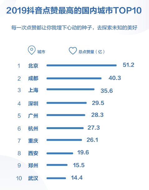 2020-01-07 12:59:00閱讀()抖音2019年,抖音上點(diǎn)贊最多的城市是哪個?最火的景點(diǎn)在哪里?最流行的音樂、貼紙是什么?不同年齡段用戶喜歡拍攝的內(nèi)容有何變化?1月6日,抖音發(fā)布《2019抖音數(shù)據(jù)報告》(以下簡稱“報告”),對以上問題進(jìn)行了解讀。