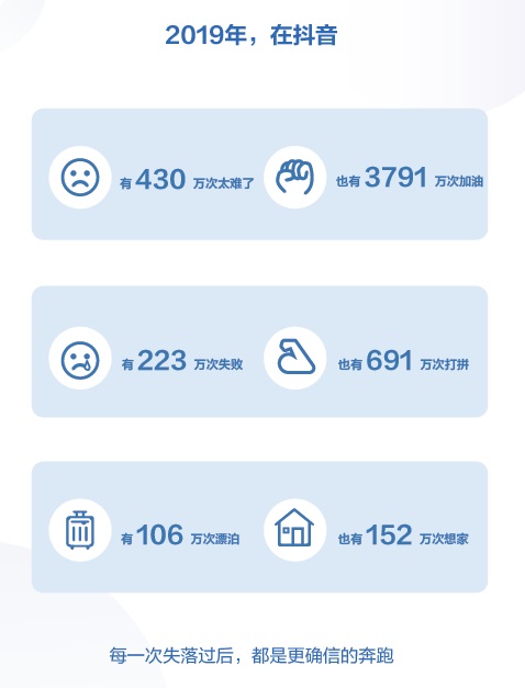 報告顯示,2019年有46萬個家庭在抖音拍下全家福視頻,記錄一家人相親相愛的幸福時刻,相關(guān)視頻被點(diǎn)贊1億次。同時,人們也在抖音記錄下淚水與歡笑,全年抖音上有430萬次“太難了”,也有3791萬次加油;有223萬次失敗,但也有691萬次打拼。