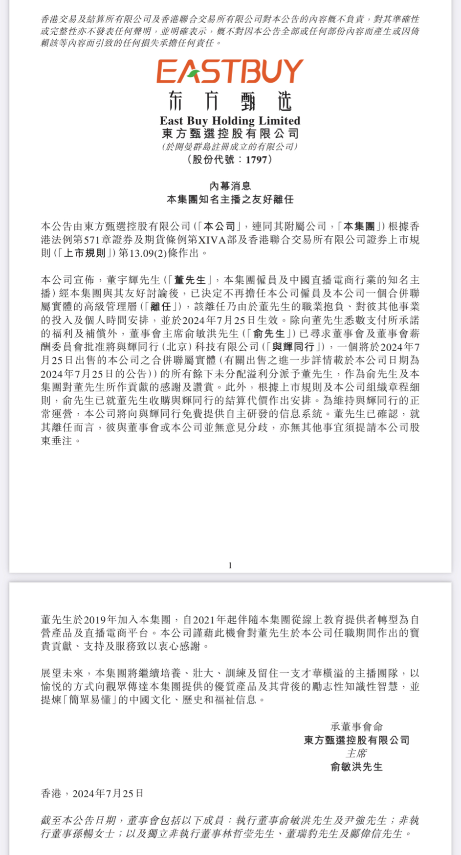 2024-07-25 21:16:44閱讀()互聯(lián)網(wǎng)從東方甄選今日港交所公告中獲悉,董宇輝已決定不再擔(dān)任公司雇員及公司一個(gè)合并聯(lián)屬實(shí)體的高級(jí)管理層,該離任乃由于董宇輝的職業(yè)抱負(fù)、對(duì)其他事業(yè)的投入及個(gè)人時(shí)間安排,并于2024年7月25日生效。