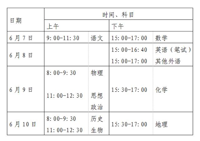 2020年高考時間,共計4天。6月7-8日統(tǒng)一高考,考試科目為語文、數(shù)學(xué)、外語3門科目,每科滿分150分;6月9-10日高中學(xué)業(yè)水平等級性考試,考試科目為思想政治、歷史、地理、物理、化學(xué)、生物6門,考生自主選擇3門。