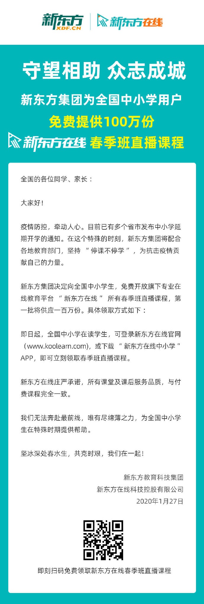 2020-01-27 12:54:00閱讀()新東方在線新型肺炎疫情幾乎成為這個春節(jié)唯一話題,馳援湖北,抗擊病毒,也稱為這個春節(jié)科技公司們都在做的事情。IT之家小編了解到,今天新東方在線發(fā)布公告稱,即日起為全國中小學(xué)用戶免費提供100萬份新東方在線春季班直播課程。