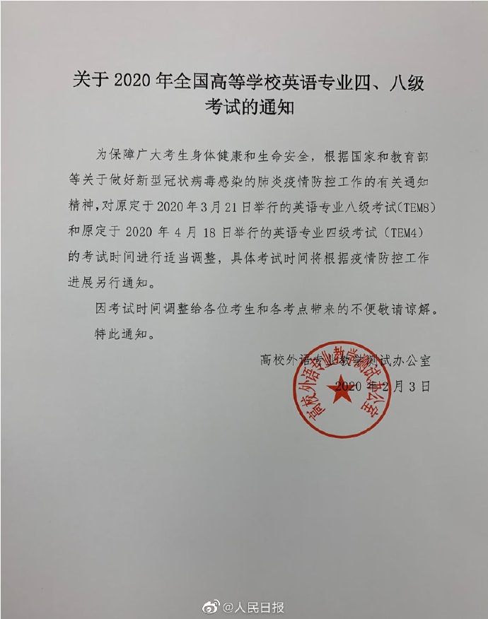 高校外語專業(yè)教學(xué)測試辦公室今天發(fā)布的通知顯示,為了保障廣大考生身體健康和生命安全,根據(jù)國家和教育部等關(guān)于做好新型冠狀病毒感染的肺炎疫情防控工作的有關(guān)通知精神,對原定于2020年3月21日舉行的英語專業(yè)八級考試(TEM8)和原定于2020年4月18日舉行的英語專業(yè)四級考試(TEM4)的考試時(shí)間進(jìn)行適當(dāng)調(diào)整,具體考試時(shí)間將根據(jù)疫情防控工作的開展另行通知。