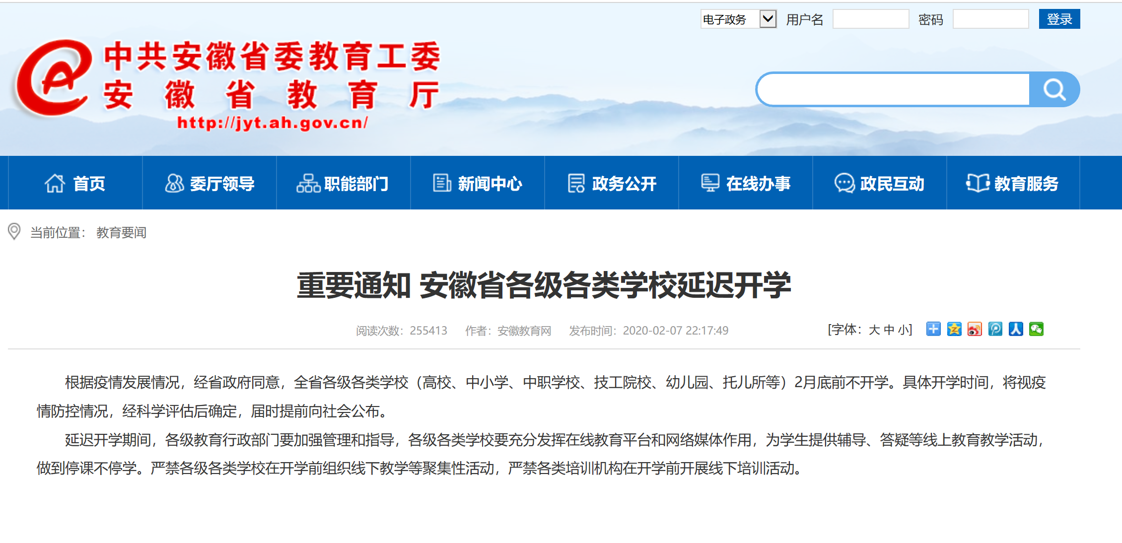 您的位置:首頁 / 行業(yè)資訊 / 重要通知:安徽省各級各類學校延遲開學