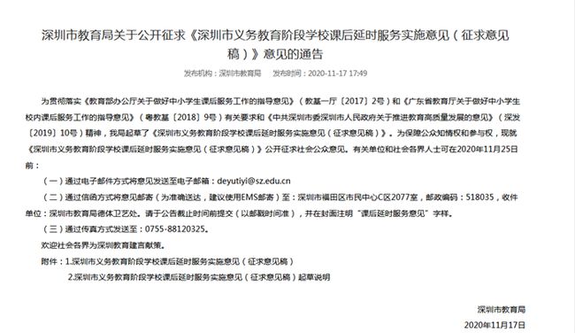 11月17日,深圳市教育局發(fā)布了《深圳市義務(wù)教育階段學(xué)校課后延時(shí)服務(wù)實(shí)施意見(jiàn)(征求意見(jiàn)稿)》(以下簡(jiǎn)稱《實(shí)施意見(jiàn)》),擬對(duì)課后延時(shí)服務(wù)做一些新的規(guī)定。