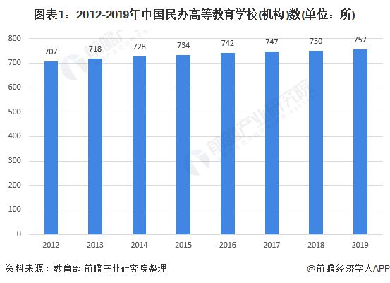 根據(jù)前瞻產(chǎn)業(yè)研究院分析,從民辦高等教育學(xué)校數(shù)量規(guī)模來看,2012-2019年,全國民辦高等教育學(xué)校逐年增加,2019年,我國民辦高等學(xué)校757所(含獨立學(xué)院257所,成人高校1所),比上年增加7所。
