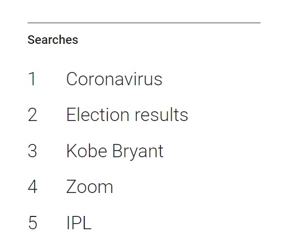 “新冠病毒”作為 2020 年最重要的全球性事件,當(dāng)之無(wú)愧是搜索榜的第一名。排在第二位的是 “選舉結(jié)果”,“科比 · 布萊恩特”位列第三。這名傳奇 NBA 球員于2020年1月26日在美國(guó)加利福尼亞州因墜機(jī)事故去世。