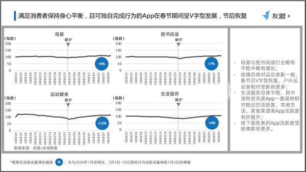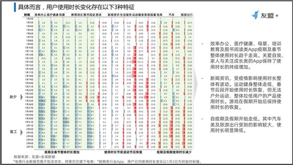 效率辦公、醫(yī)療健康、母嬰、培訓(xùn)教育及圖書閱讀類App疫期及春節(jié)整體使用時長趨于走高。關(guān)愛自我、家人與關(guān)注成長類的App保持了使用時長的持續(xù)增加。