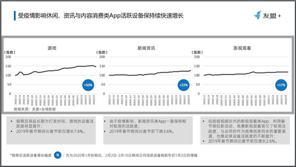 假期及其延長期為打發(fā)時間,游戲的設(shè)備活躍度明顯提升;而新聞資訊類App一直保持相對較高的活躍度;包括短視頻在內(nèi)的影視觀看類App,利用春節(jié)期拉新活動、免費(fèi)觀看吸引了較高活躍度,與此同時作為疫情信息同步的重要渠道,也推動其設(shè)備活躍度的不斷提升。