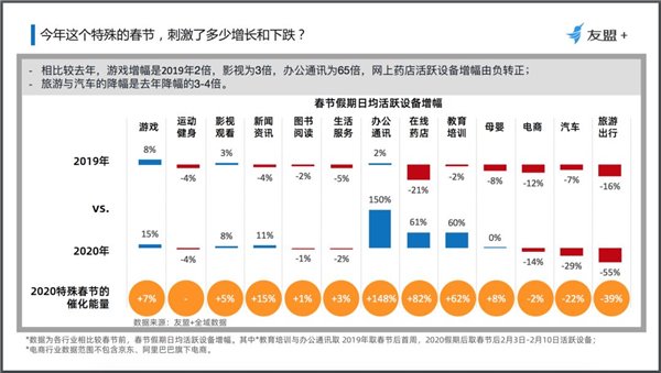 綜合來看,今年這個特殊的春節(jié)相較于去年,整個行業(yè)變化如下圖。其中游戲行業(yè)增幅15%,是2019年的2倍;影視增幅8%,是去年的3倍左右;辦公通訊上漲明顯,增幅150%,網(wǎng)上藥店活躍設(shè)備增幅由負(fù)轉(zhuǎn)正,增幅61%;旅游與汽車的降幅是去年的3-4倍,分別下跌55%及29%。
