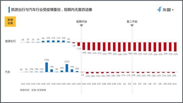 疫情對旅游出行與汽車類App影響極為嚴(yán)重,這兩類App受疫情與假期疊加因素重創(chuàng),全面下跌。