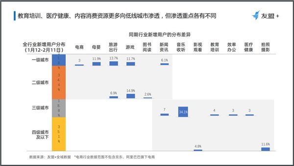 另外,教育培訓(xùn)、醫(yī)療健康、內(nèi)容消費(fèi)資源開始更多的向低線城市滲透,但滲透重點(diǎn)各有不同。例如,三線城市在音樂收聽類APP上新增了大量用戶,同比增幅為34.1%;而四線城市則集中增長在拍照攝影類APP上。