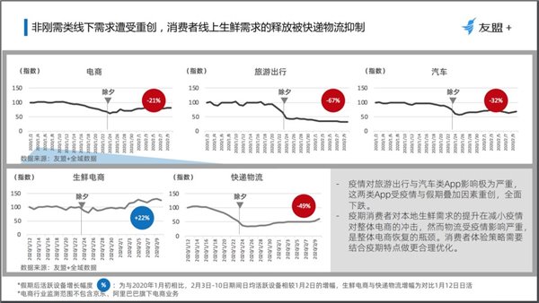 通過對武漢與非武漢地區(qū)23日前后新增設(shè)備的對比,《分析》顯示:對于工作、出行等相關(guān)應(yīng)用的需求顯著下降,快遞物流、租房等需求也受到不同程度的影響;而更多關(guān)注于與家人的聯(lián)系,以及緩解疫情的緊張氛圍,因此通訊社交、游戲類等應(yīng)用的需求大幅提升。