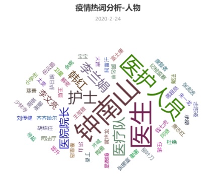 我們對(duì)疫情相關(guān)熱搜中與人物相關(guān)的詞作了統(tǒng)計(jì),其中出現(xiàn)頻率最高的是鐘南山院士,其次是醫(yī)護(hù)人員、醫(yī)生、醫(yī)療隊(duì)和護(hù)士。