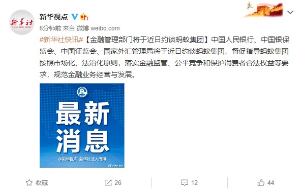 央行、銀保監(jiān)會(huì)、證監(jiān)會(huì)、國(guó)家外匯管理局將于近日約談螞蟻集團(tuán)