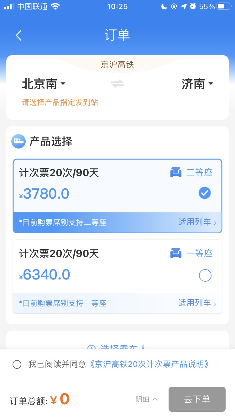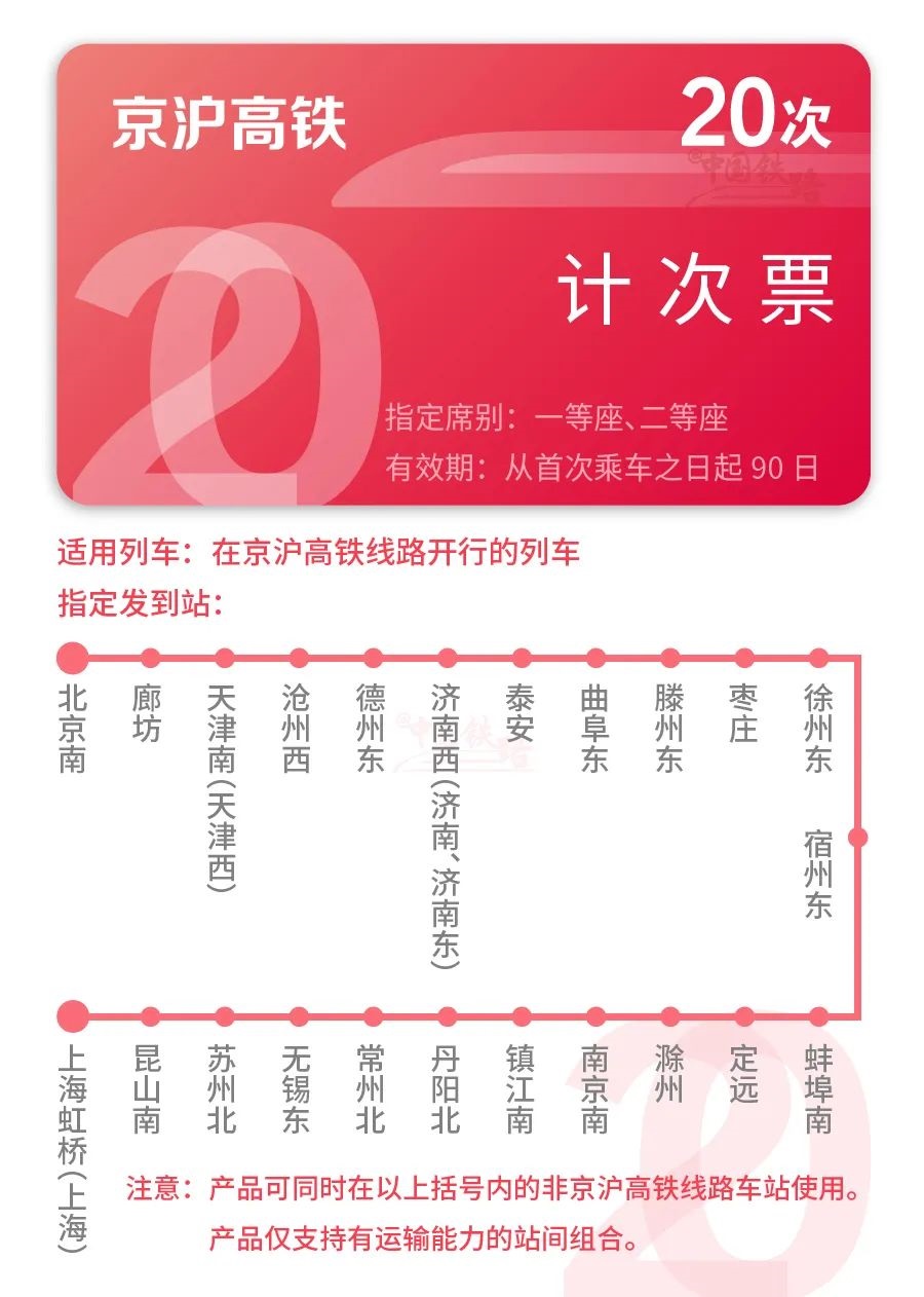 另外京滬高鐵沿線的一些區(qū)間站也可以購(gòu)買(mǎi),比如北京南站到濟(jì)南站,二等座計(jì)次票 20 次 / 90 天售價(jià) 3780 元,平均每次票價(jià)為 189 元;一等座計(jì)次票 20 次 / 90 天售價(jià) 6340 元,平均每次票價(jià)為 317 元。