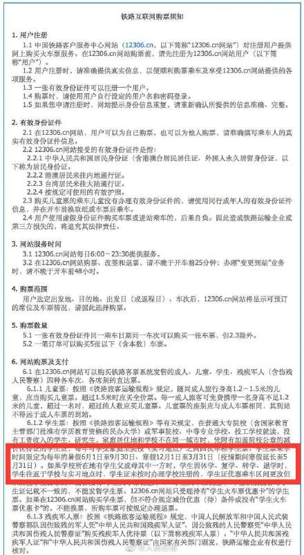 2020-03-15 20:39:35閱讀()123063月15日消息 中國(guó)鐵路12306官方網(wǎng)站近日更新《鐵路互聯(lián)網(wǎng)購(gòu)票須知》:疫情期間,學(xué)生票寒假的乘車(chē)時(shí)間已由12月1日至3月31日延長(zhǎng)至5月31日。