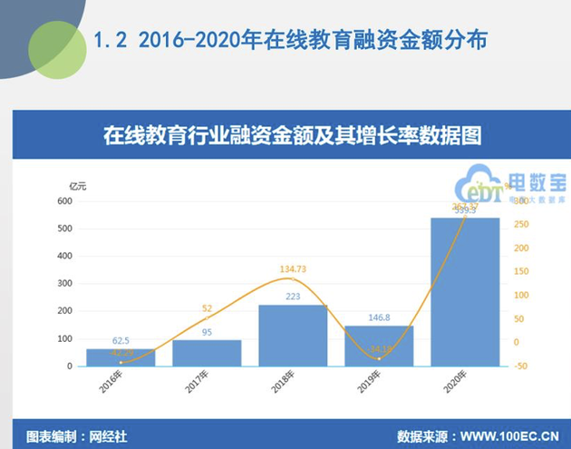 但是,在線教育領(lǐng)域的融資總額卻達(dá)到了歷史高位,融資總額超過(guò) 539.3 億元,同比增長(zhǎng) 267.37%。這一總額比 2016 年到 2019 年四年的融資總額都要多。
