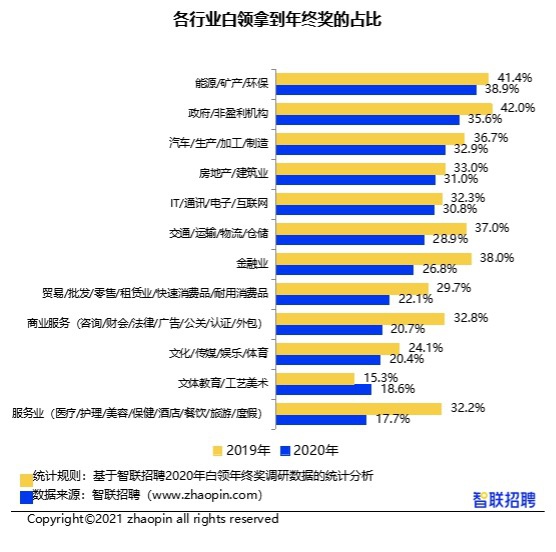 而智聯(lián)招聘提供的《2020 年白領(lǐng)滿意度指數(shù)調(diào)研報(bào)告》則顯示,2019 年,文體教育 / 工藝美術(shù)行業(yè)拿到年終獎(jiǎng)的白領(lǐng)比例為 15.3%,在 2020 年這一比例升至 18.6%,是唯一實(shí)現(xiàn)正增長(zhǎng)的行業(yè)。