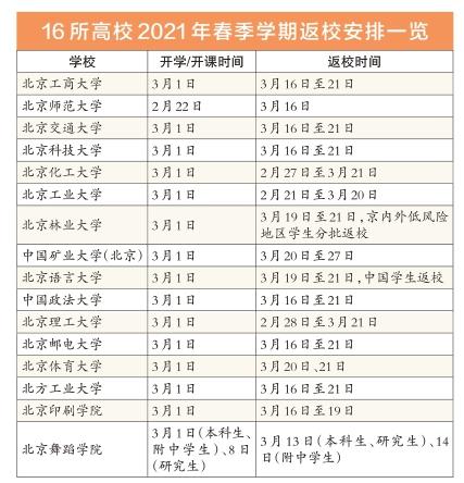 2021-02-18 11:03:33閱讀()北京日報對于在京高校大學生而言,即將到來的2021年春季學期,“如期開學、延遲返校”將成為潮流。記者近日從官方渠道了解到,北京師范大學、北京交通大學、北京科技大學、北京化工大學等16所在京高校均發(fā)布最新通知,新學期在原計劃的開學之日以線上教學方式開課,時間大多集中于3月1日;學生返校日期則延后至3月中下旬。