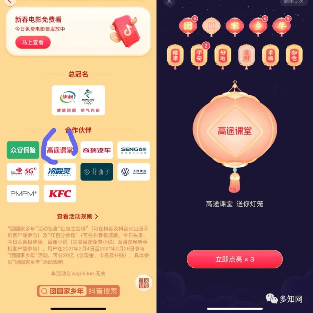跟誰學(xué)旗下的高途課堂雖然沒有直接出現(xiàn)在“春晚”上,但是高途課堂聯(lián)合贊助了抖音“團(tuán)圓家鄉(xiāng)年”活動(dòng),該活動(dòng)是春晚紅包的環(huán)節(jié)之一。