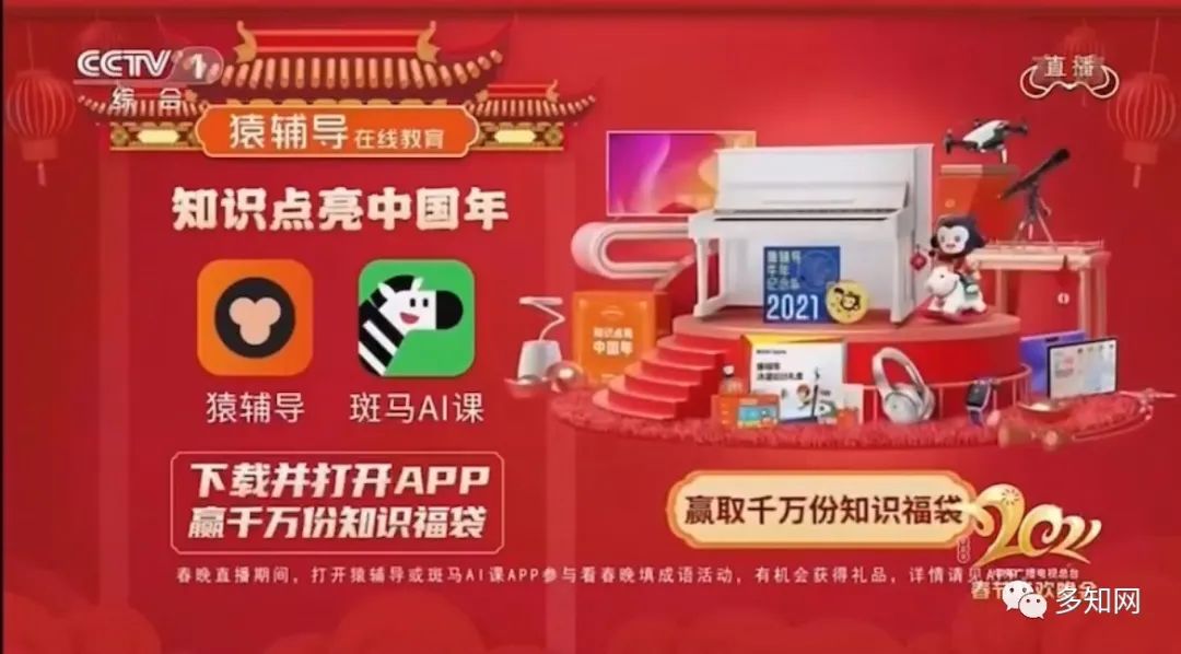今年,猿輔導(dǎo)再次與春晚合作,2020年春晚口播了猿輔導(dǎo)。而今年,猿輔導(dǎo)與春晚合作又進(jìn)一步。一種形式是主持人口播介紹猿輔導(dǎo)的“知識福袋”活動(dòng),一種是植入在小品《陽臺(tái)》中。