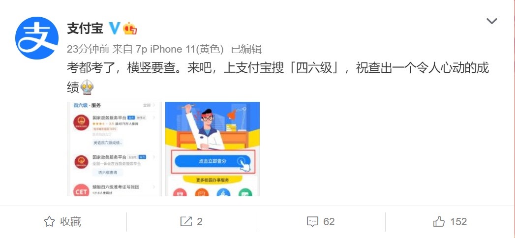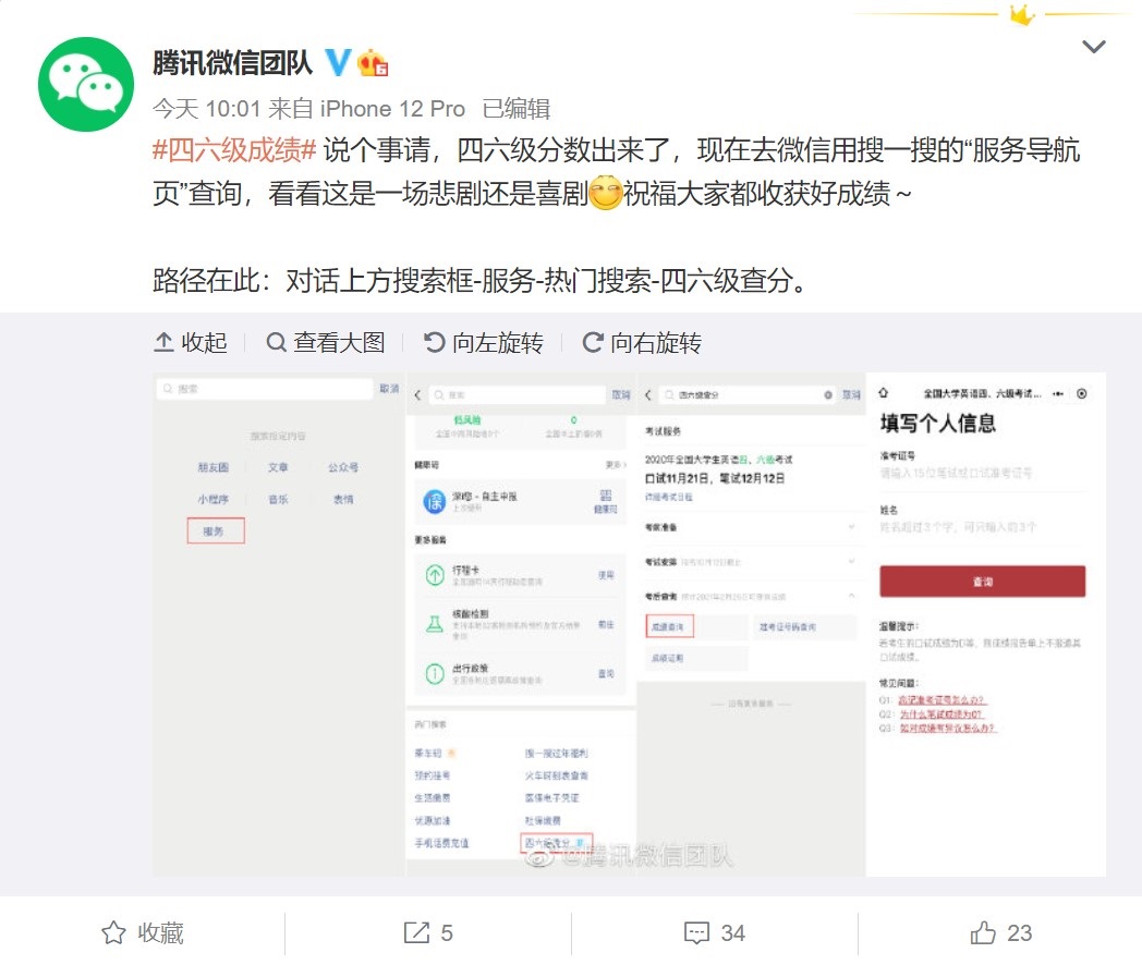 今日午間,@支付寶 微博發(fā)文稱,用戶可通過(guò)支付寶搜索 “四六級(jí)”查分。26日上午,微信也發(fā)布消息稱,微信搜一搜聯(lián)合國(guó)家政務(wù)服務(wù)平臺(tái)為廣大考生提供四六級(jí)成績(jī)查詢服務(wù)。屆時(shí),廣大考生可通過(guò)微信搜一搜進(jìn)行四六級(jí)查分,具體路徑為:對(duì)話上方搜索框 - 服務(wù) - 熱門搜索 - 四六級(jí)查分。