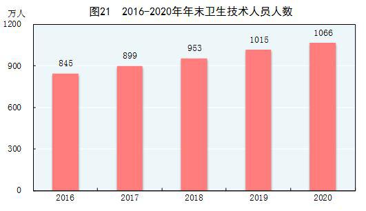 年末全國共有醫(yī)療衛(wèi)生機構(gòu)102.3萬個,其中醫(yī)院3.5萬個,在醫(yī)院中有公立醫(yī)院1.2萬個,民營醫(yī)院2.4萬個;基層醫(yī)療衛(wèi)生機構(gòu)97.1萬個,其中鄉(xiāng)鎮(zhèn)衛(wèi)生院3.6萬個,社區(qū)衛(wèi)生服務(wù)中心(站)3.5萬個,門診部(所)29.0萬個,村衛(wèi)生室61.0萬個;專業(yè)公共衛(wèi)生機構(gòu)1.4萬個,其中疾病預(yù)防控制中心3384個,衛(wèi)生監(jiān)督所(中心)2736個。年末衛(wèi)生技術(shù)人員1066萬人,其中執(zhí)業(yè)醫(yī)師和執(zhí)業(yè)助理醫(yī)師408萬人,注冊護士471萬人。醫(yī)療衛(wèi)生機構(gòu)床位911萬張,其中醫(yī)院713萬張,鄉(xiāng)鎮(zhèn)衛(wèi)生院139萬張。全年總診療人次[62]78.2億人次,出院人數(shù)[63]2.3億人。截至年末,全國累計報告新型冠狀病毒肺炎確診病例87071例,累計治愈出院病例82067例,累計死亡4634人。全國共有8177家醫(yī)療衛(wèi)生機構(gòu)提供新型冠狀病毒核酸檢測服務(wù),總檢測能力達到1153萬份/天。