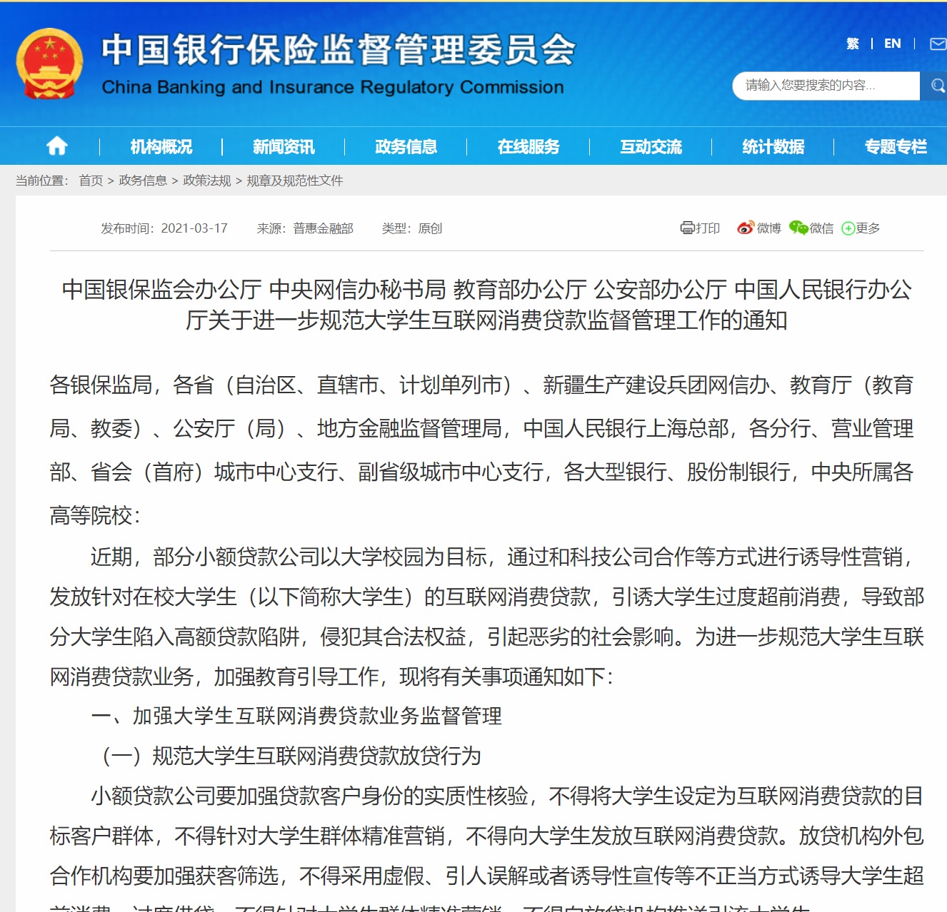 3月17日,銀保監(jiān)會官網(wǎng)發(fā)布《關(guān)于進(jìn)一步規(guī)范大學(xué)生互聯(lián)網(wǎng)消費貸款監(jiān)督管理工作的通知》(下稱《通知》)。該《通知》由銀保監(jiān)會辦公廳、中央網(wǎng)信辦秘書局、教育部辦公廳、公安部辦公廳、人民銀行辦公廳于近日聯(lián)合印發(fā)。