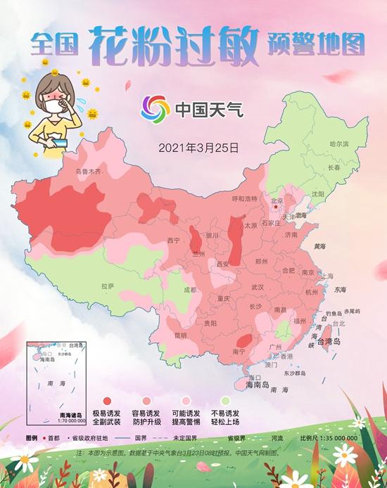 2021-03-24 22:15:29閱讀()人民網(wǎng)本周伊始,我國(guó)大部地區(qū)暖陽(yáng)照耀,進(jìn)入大回暖模式。不少地方草木萌動(dòng)、春花綻放,一派春意盎然,但是惱人的花粉也開(kāi)始“爆發(fā)”,中國(guó)天氣網(wǎng)特推出全國(guó)花粉過(guò)敏預(yù)警地圖,來(lái)看看哪些區(qū)域極易誘發(fā)花粉過(guò)敏,提醒過(guò)敏星人注意防范。