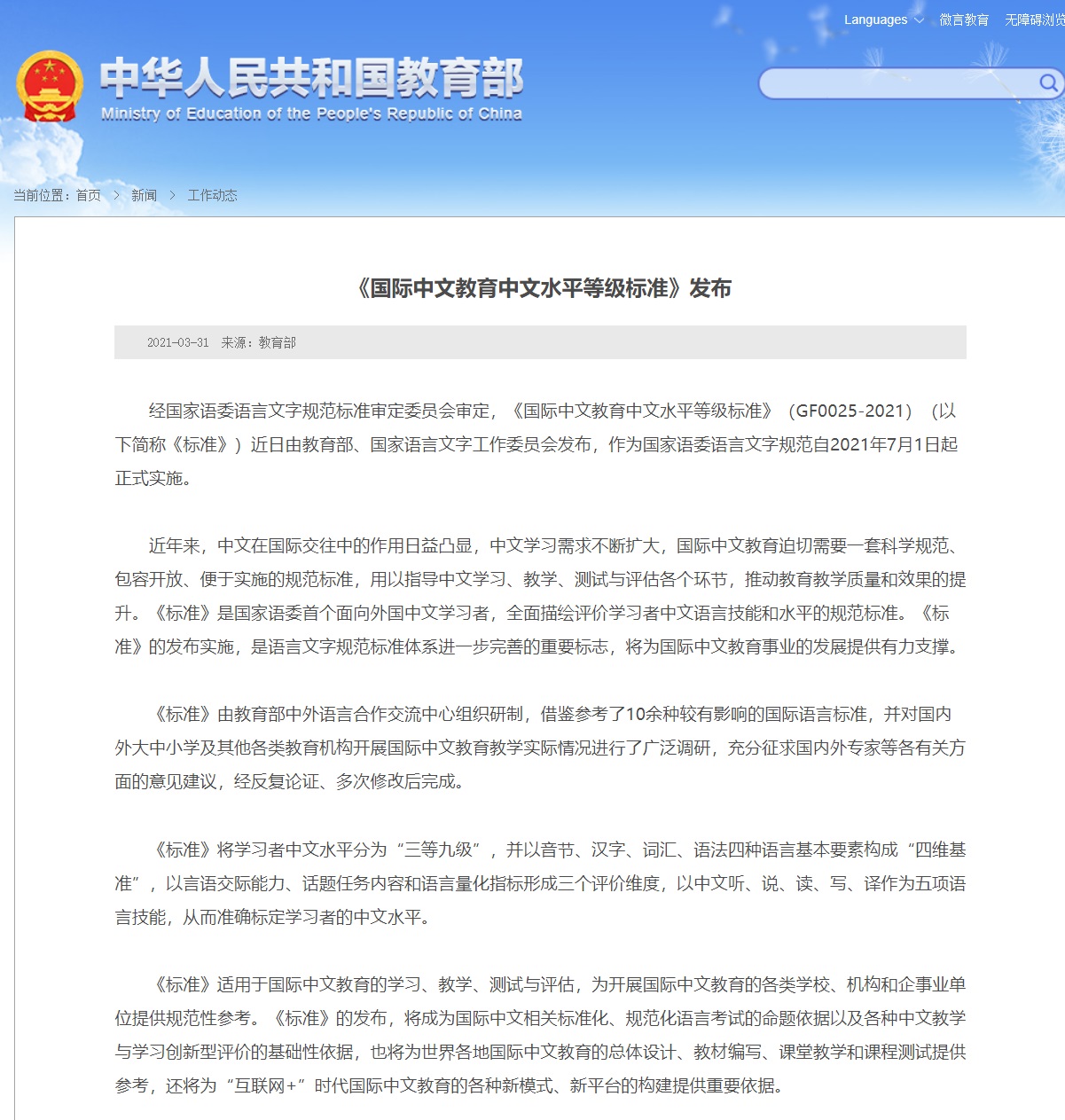 2021-03-31 18:11:52閱讀()教育部據(jù)教育部網(wǎng)站發(fā)布,經(jīng)國(guó)家語(yǔ)委語(yǔ)言文字規(guī)范標(biāo)準(zhǔn)審定委員會(huì)審定,《國(guó)際中文教育中文水平等級(jí)標(biāo)準(zhǔn)》(GF0025-2021)(以下簡(jiǎn)稱《標(biāo)準(zhǔn)》)近日由教育部、國(guó)家語(yǔ)言文字工作委員會(huì)發(fā)布,作為國(guó)家語(yǔ)委語(yǔ)言文字規(guī)范自2021年7月1日起正式實(shí)施。