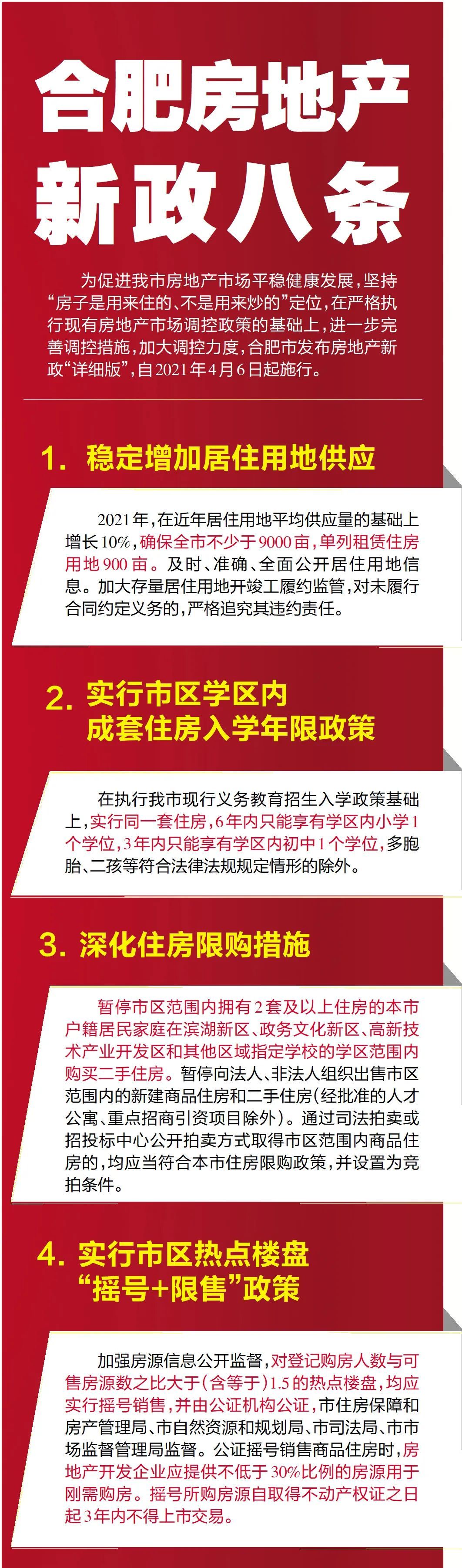 2021-04-06 09:44:18閱讀()合肥日報合肥市發(fā)布房地產(chǎn)“新政八條”,涵蓋學(xué)位制、二手住房限購、熱點樓盤“搖號+限售”等八個方面。新政自2021年4月6日起施行。