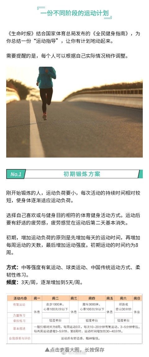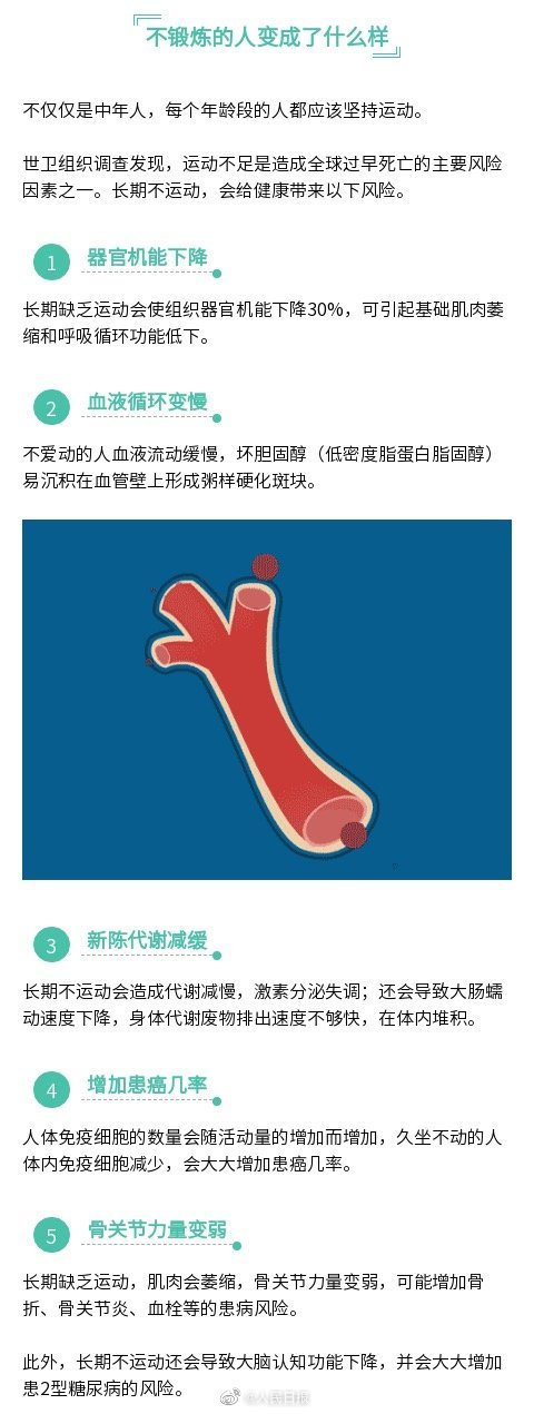 世衛(wèi)組織調(diào)查發(fā)現(xiàn),運(yùn)動不足是造成全球過早死亡的主要風(fēng)險因素之一。長期不運(yùn)動,會給健康帶來這些風(fēng)險:器官機(jī)能下降、血液循環(huán)變慢、新陳代謝變慢……結(jié)合國家體育總局發(fā)布的《全民健身指南》,為你總結(jié)一份“運(yùn)動指導(dǎo)”,讓你有計劃地動起來。
