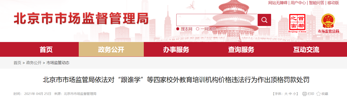 北京市市場監(jiān)管局依法對“跟誰學(xué)”等四家校外教育培訓(xùn)機(jī)構(gòu)價格違法行為作出頂格罰款處罰