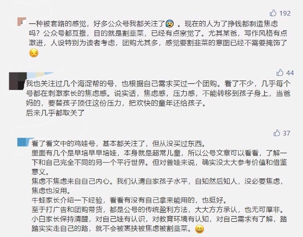 “雞娃號”一事曝光后,不少教育類自媒體賬號發(fā)文稱自己也曾被類似的公司找過,對方提出收編其賬號,并為其提供內(nèi)容、流量和運營的扶持,幫助精準漲粉,再通過團購等形式實現(xiàn)盈利。
