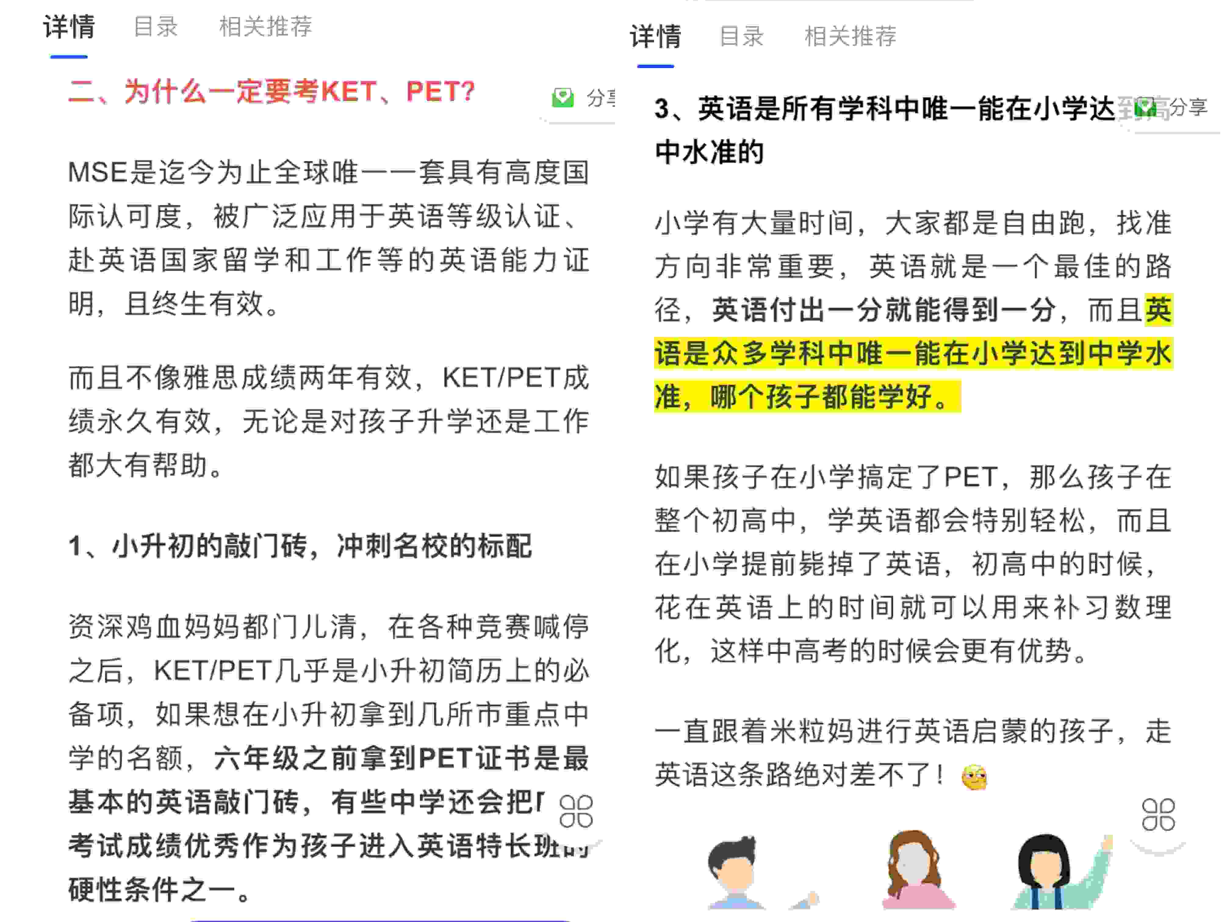 在課程詳情中,KET和PET考試卻被稱作“小升初的敲門磚,沖刺名校的標配”,甚至提到,“英語是眾多學科中唯一能在小學達到中學水準,哪個孩子都能學好”,直指“超前教育”。列表顯示,有2409人花費349元開通了KET課程;PET課程售價399元,已有795人開通。