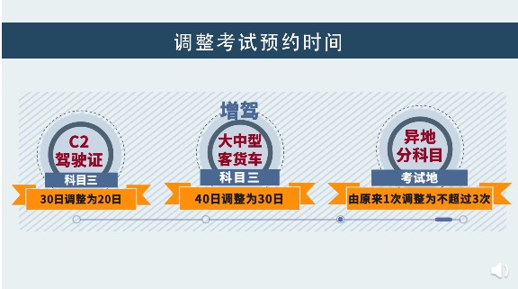 ②自動擋科目三約考間隔時間,由科目一考試合格后30日調整為20日;