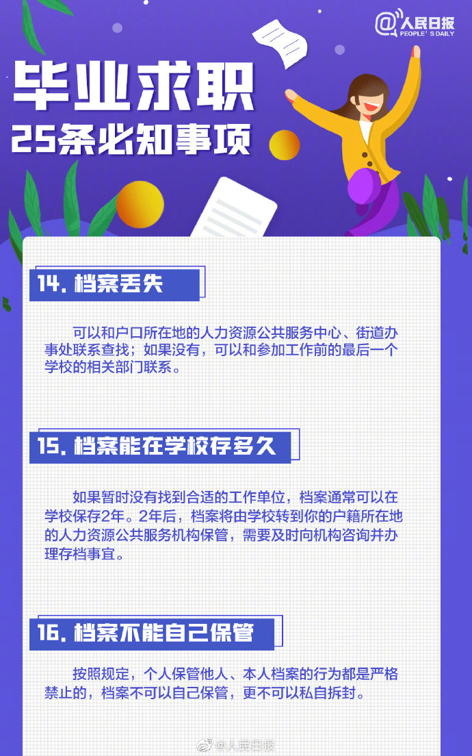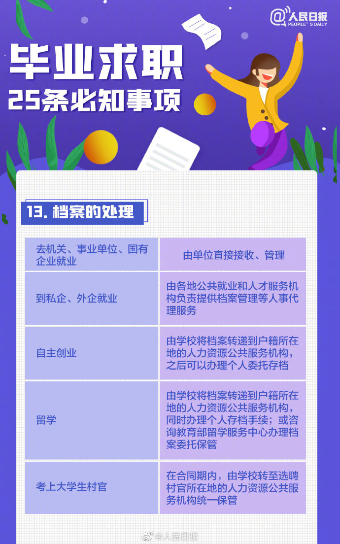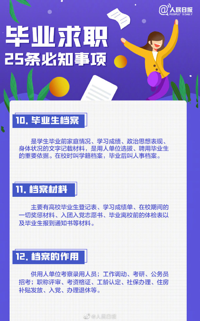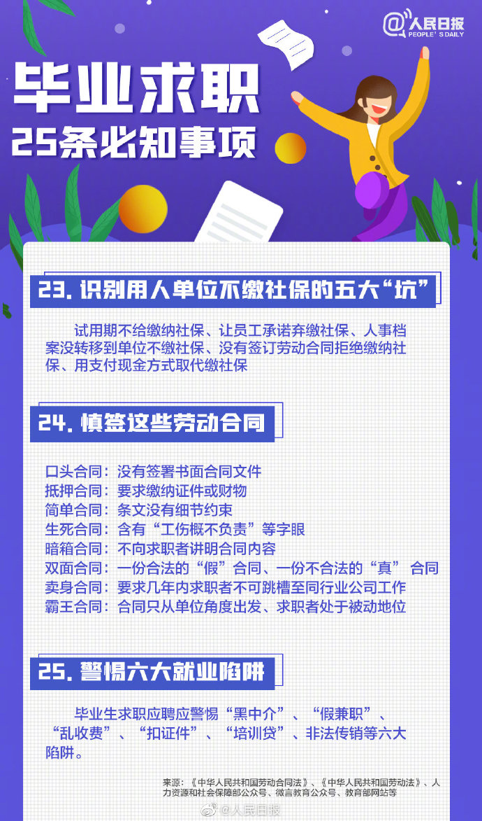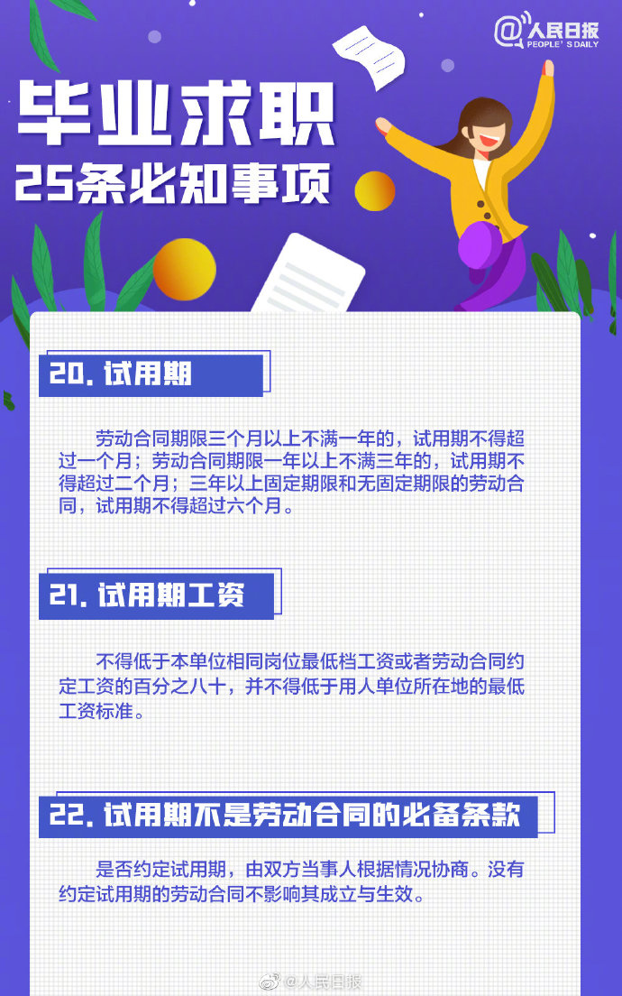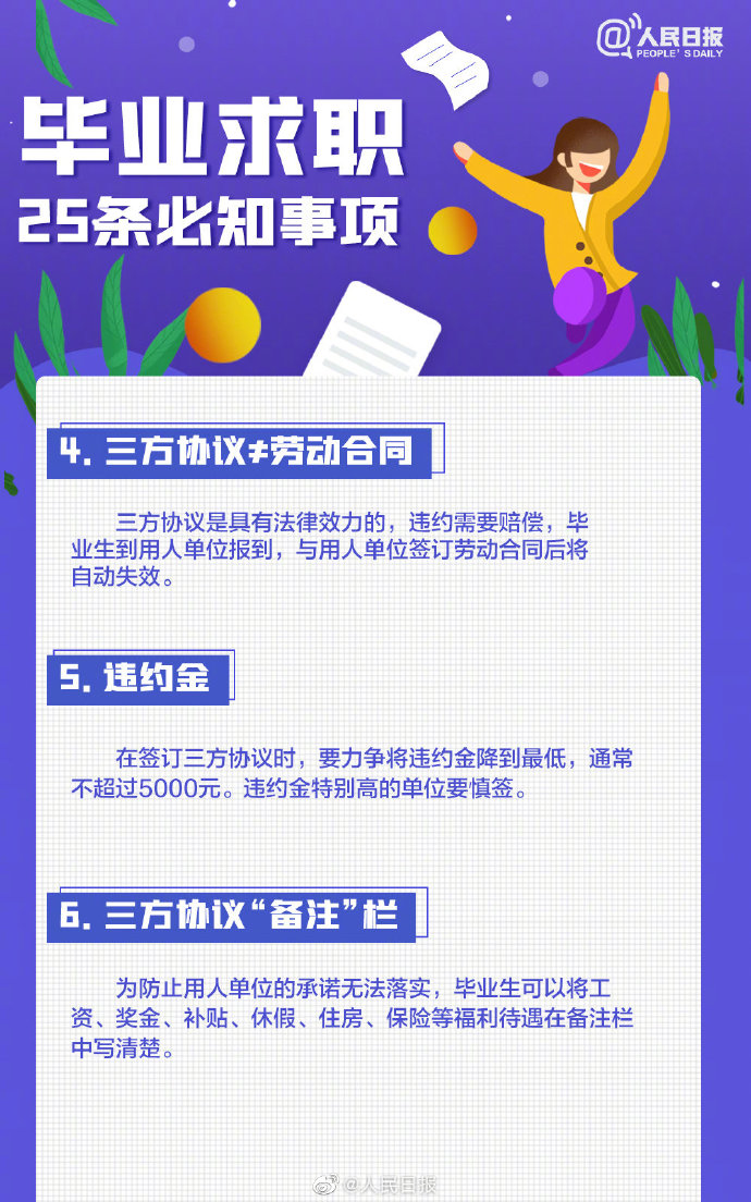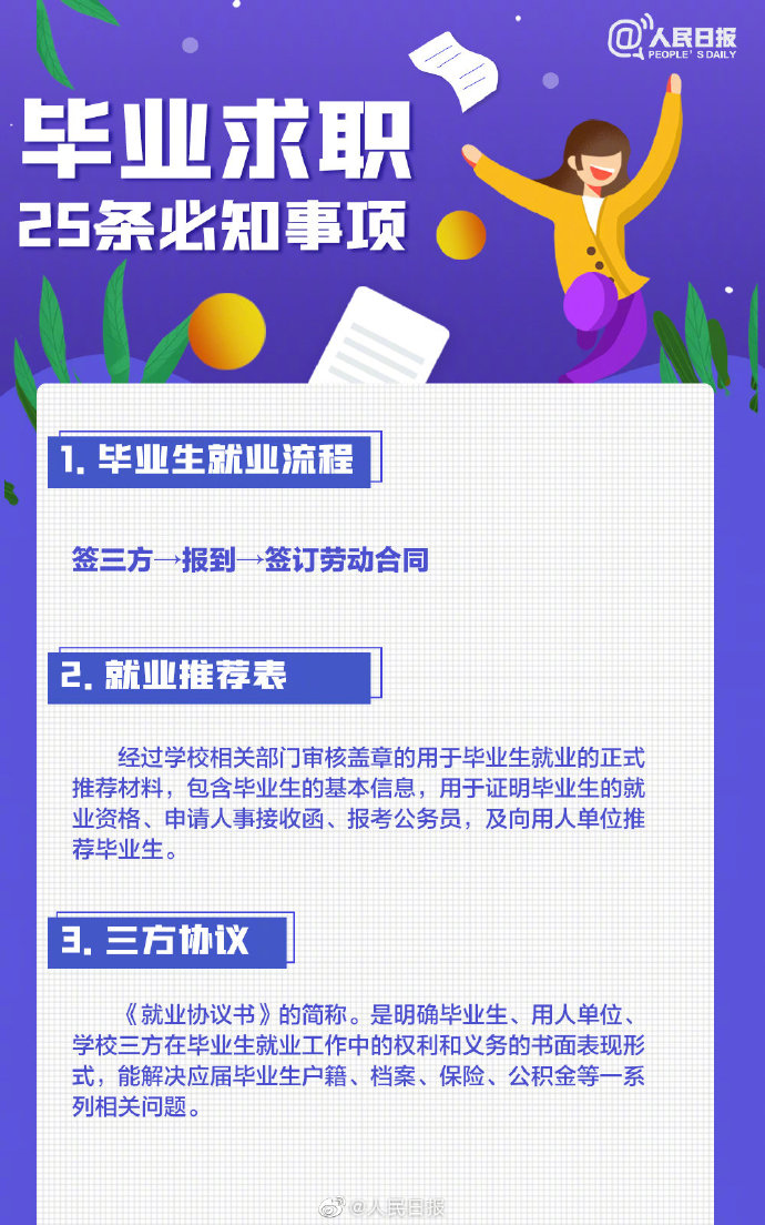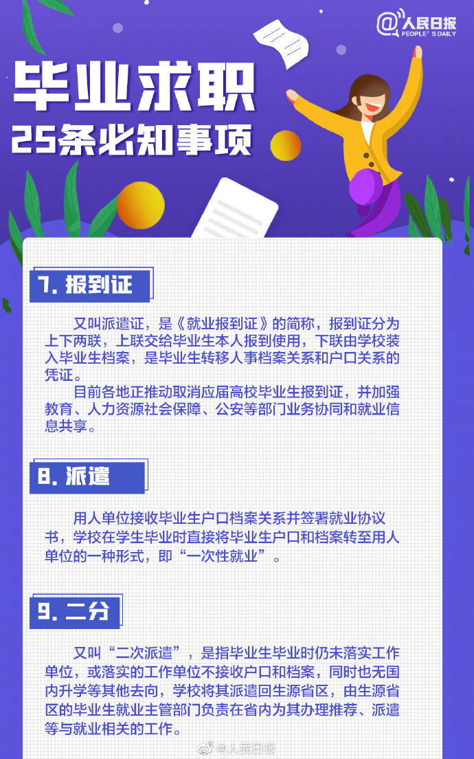 2021-05-13 09:41:26閱讀()人民日報離2021年畢業(yè)季已不到50天,今年高校畢業(yè)生總規(guī)模預(yù)計909萬人。即將畢業(yè)的你是否還在忙著投簡歷、找工作?派遣、二分、檔案、試用期……這些詞,你都搞清楚了嗎?簽勞動合同要關(guān)注哪些要點?求職前,這些事你應(yīng)該了解↓↓轉(zhuǎn)給即將離校的你,祝一切順利,畢業(yè)快樂! ????