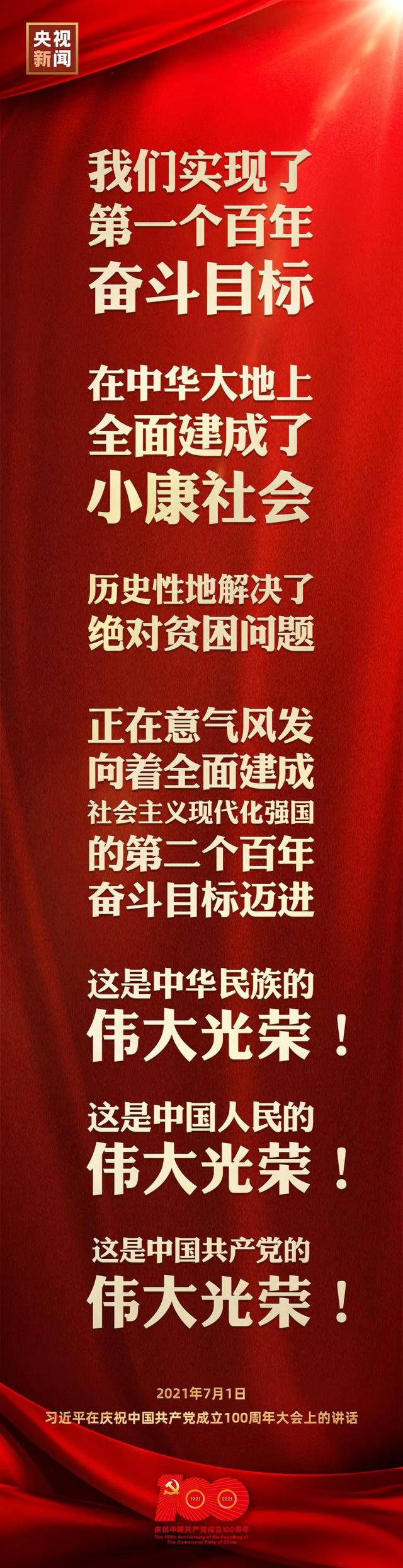 習(xí)近平代表黨和人民莊嚴(yán)宣告,經(jīng)過全黨全國各族人民持續(xù)奮斗,我們實(shí)現(xiàn)了第一個(gè)百年奮斗目標(biāo),在中華大地上全面建成了小康社會(huì),歷史性地解決了絕對貧困問題,正在意氣風(fēng)發(fā)向著全面建成社會(huì)主義現(xiàn)代化強(qiáng)國的第二個(gè)百年奮斗目標(biāo)邁進(jìn)。這是中華民族的偉大光榮!這是中國人民的偉大光榮!這是中國共產(chǎn)黨的偉大光榮!