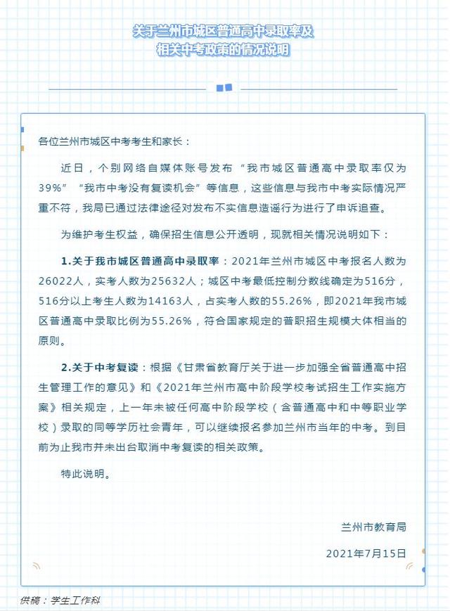 2021-07-16 11:16:23閱讀()蘭州市教育局7月16日電 蘭州市教育局15日在官方微信公眾號上發(fā)布《關(guān)于蘭州市城區(qū)普通高中錄取率及相關(guān)中考政策的情況說明》稱,近日,個(gè)別網(wǎng)絡(luò)自媒體賬號發(fā)布“蘭州市城區(qū)普通高中錄取率僅為39%”“蘭州市中考沒有復(fù)讀機(jī)會”等信息,這些信息與蘭州市中考實(shí)際情況嚴(yán)重不符,蘭州市教育局已通過法律途徑對發(fā)布不實(shí)信息造謠行為進(jìn)行了申訴追查。