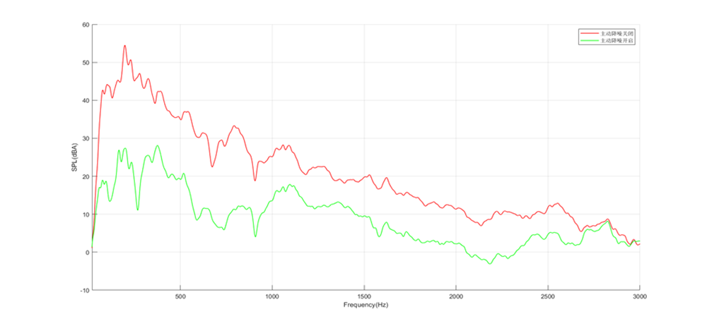 例如,圖中的紅色曲線是主動降噪關(guān)閉后的噪音曲線,綠色曲線是主動降噪開啟后的噪聲曲線,中間的差額就是降噪深度。