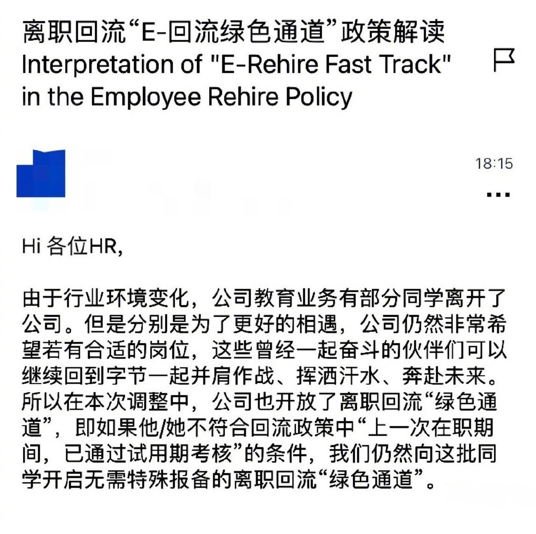 近日有字節(jié)跳動員工在脈脈表示:收到公司發(fā)給hr的郵件,被裁的字節(jié)教育系員工都會在系統(tǒng)里保留一個回流綠色通道,可不受回流政策限制。