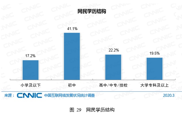 此外,初中、高中/中專/技校學(xué)歷的網(wǎng)民群體占比分別為41.1%、22.2%,受過(guò)大學(xué)??萍耙陨辖逃木W(wǎng)民群體占比為19.5%。
