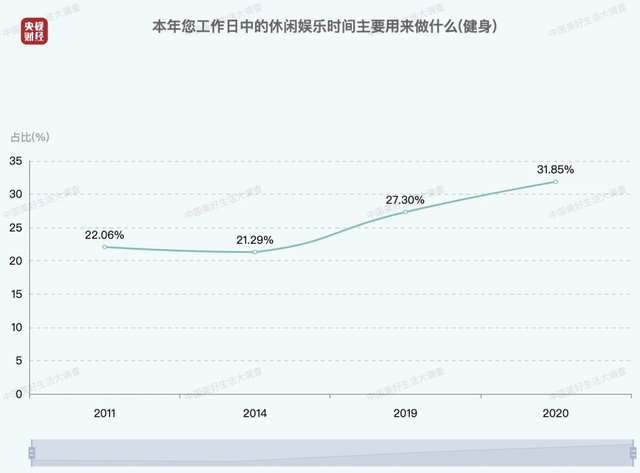 《中國(guó)美好生活大調(diào)查》發(fā)現(xiàn),健身的人群比六年前增長(zhǎng)了10%。