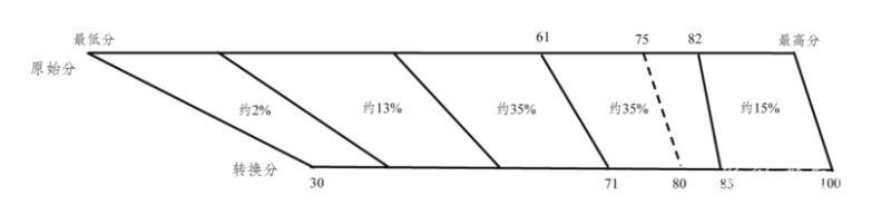 第二步,同一等級內,根據(jù)考生的原始分、所在等級的原始分區(qū)間和轉換分區(qū)間,按照分數(shù)轉換公式,計算得到考生的轉換分。